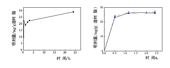 Static adsorption kinetic curve of bovine serum albumin (left, 1mg / ml, 0.1% trifluoro acetic acid aqueous solution) and insulin P1 (right, 35% ethanol solution)